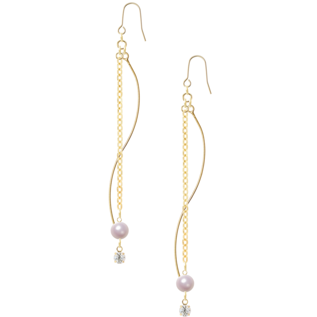 華奢なゴールドチェーンとやさしい色合いのピンクパールを組み合わせた、女性らしいロングピアスです。