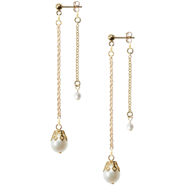 華奢なゴールドチェーンと上品なパールを組み合わせた、女性らしいロングピアスです。